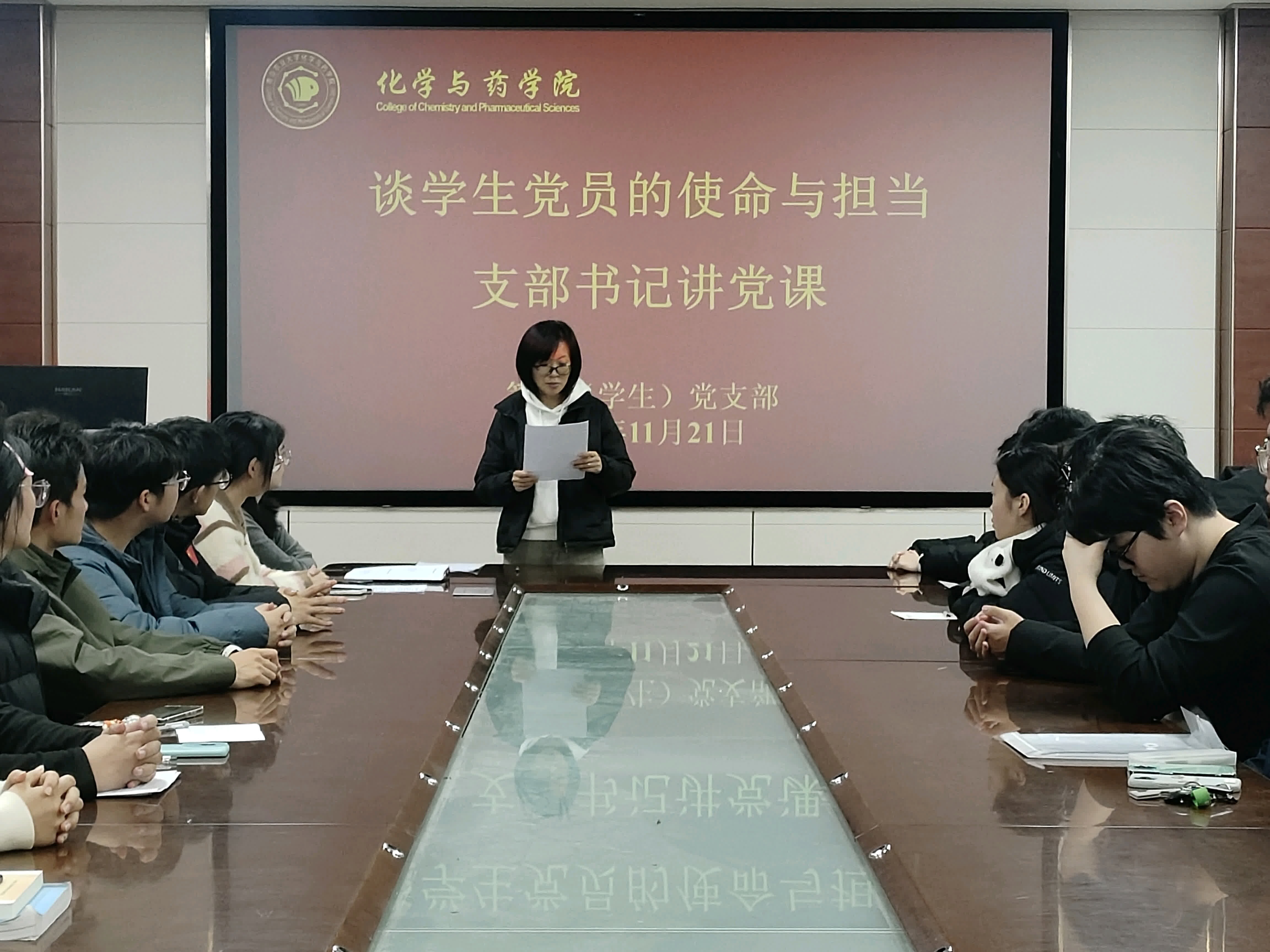 为深入学习贯彻党的二十届四中全会精神,强化学生党员的责任意识与先锋模范作用,11月21日,yl23411永利官网第五(学生)党支部在化学楼207会议室组织开展“谈学生党员的使命与担当”专题党课。第五党支部书记黄海红主讲,党支部全体党员参加学习。
