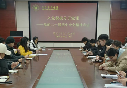 为深入学习贯彻党的二十届四中全会精神,推动全会精神在基层落地生根,引导学生党员将理论学习与专业发展、时代使命紧密结合,12月15日,yl23411永利官网第五(学生)党支部在化学楼207会议室举办党的二十届四中全会精神宣讲会。会议由党支部书记黄海红主讲,支部全体党员和入党积极分子参加学习。